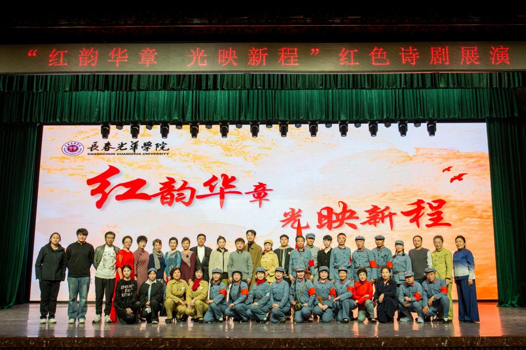 10月28日,由我校主办、长春市红色印记朗诵艺术团承办的“红韵华章 光映新程——纪念中国人民抗日战争暨世界反法西斯战争胜利80周年”红色诗剧展演在我校北区图书馆艺术剧场举行。演出吸引了600余名师生及“青马学员”一同到场观摩学习。
