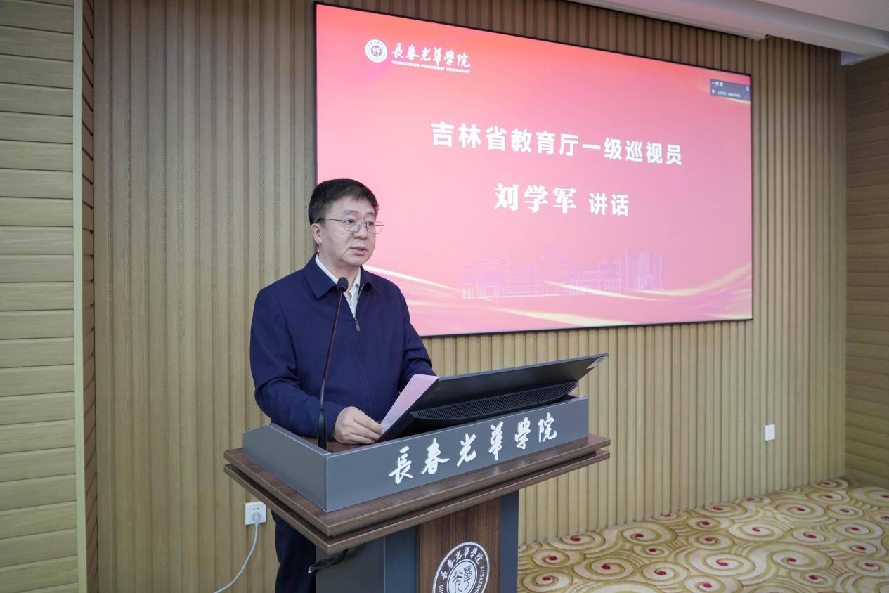 吉林省教育厅一级巡视员刘学军在讲话中指出,新一轮审核评估是落实教育强国战略、深化新时代教育评价改革的关键抓手,对推动高校内涵式发展、提升人才自主培养质量具有重要意义。他充分肯定长春光华学院作为吉林省高水平应用型民办本科高校,在服务地方经济社会发展中发挥的积极作用,并提出三点希望:一是凝聚思想共识,汇聚评建合力,确保审核评估工作高质高效开展;二是把握评估机遇,聚焦内涵提升,全力实现以评促强目标;三是深悟评估要义,严守规范程序,共促评估生态健康持续。他强调,要以“平常心、正常态”“学习心、开放态”迎接评估,共同营造风清气正、务实高效的评估氛围。