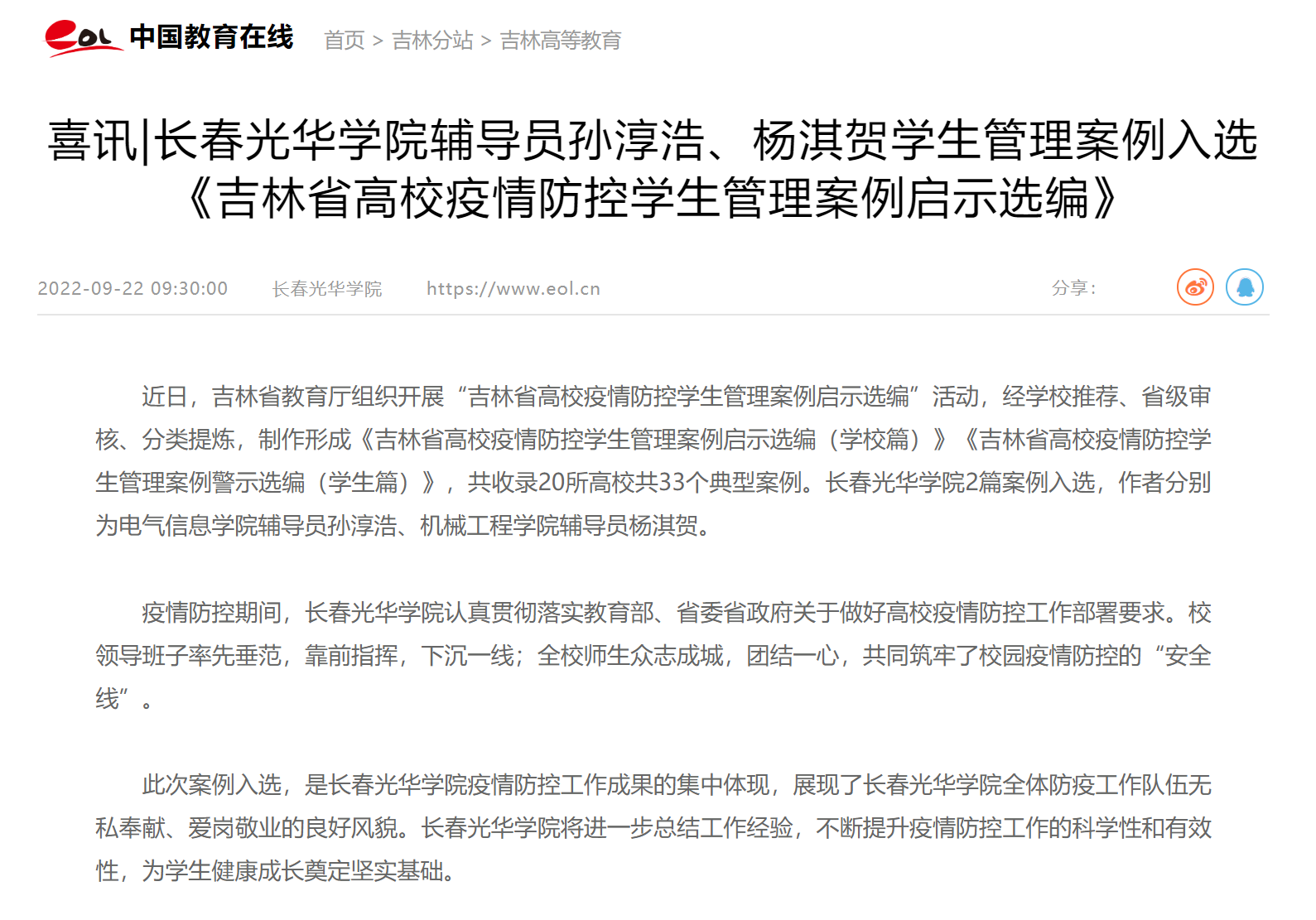 中国教育在线|长春光华学院辅导员孙淳浩、杨淇贺学生管理案例入选《吉林省高校疫情防控学生管理案例启示选编》